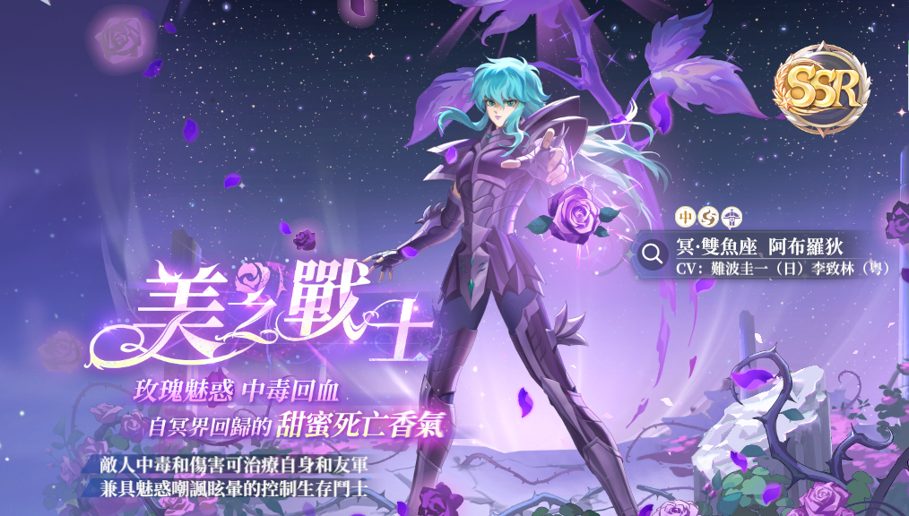冥·雙魚座 阿布羅狄的各項技能,皆能造成敵方中毒,並可藉由被動技來達到恢復效果,是輸出與回復兼備的輔助角色,可搭配各種陣容;